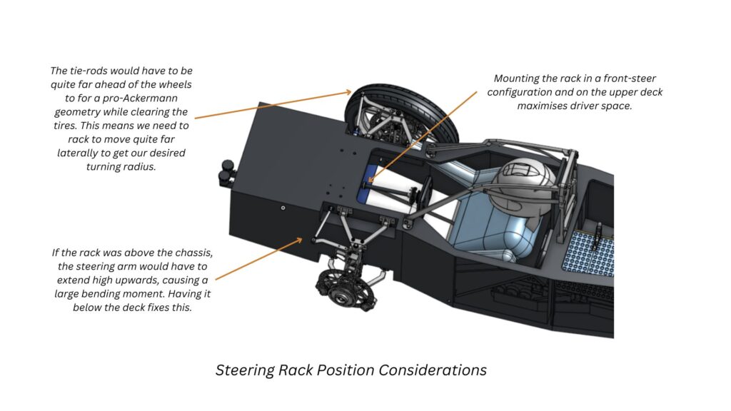 I tried a few different layouts but converged to using a front-steer configuration, placing a steering rack under the top deck of the carbon chassis. This would maximise space around the driver and ensure they can get in and out relatively easily.