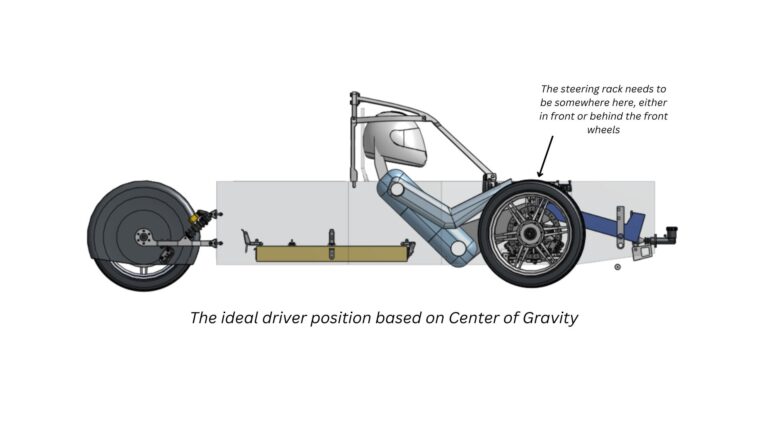 After messing around with the position of the heaviest parts of the car, I found the optimal position of the driver to be quite far forward and almost above the front wheels. This would mean there would be little room for the steering assembly.