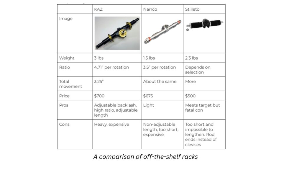 With the position set based on packaging, I could then derive the following specifications: Maximum rack travel > 90mm, Steering ratio < 3.25 turns/rev. None of the off-the-shelf racks worked for this as they were more targeted towards FSAE or similar racing configurations. They were also quite expensive, which is a high-weight consideration being a new team.