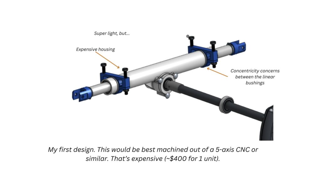 Our manufacturing capabilities were limited, so the housing would’ve needed outsourcing. After giving it a thorough think through, I came up with a non-standard second version that I like much more.