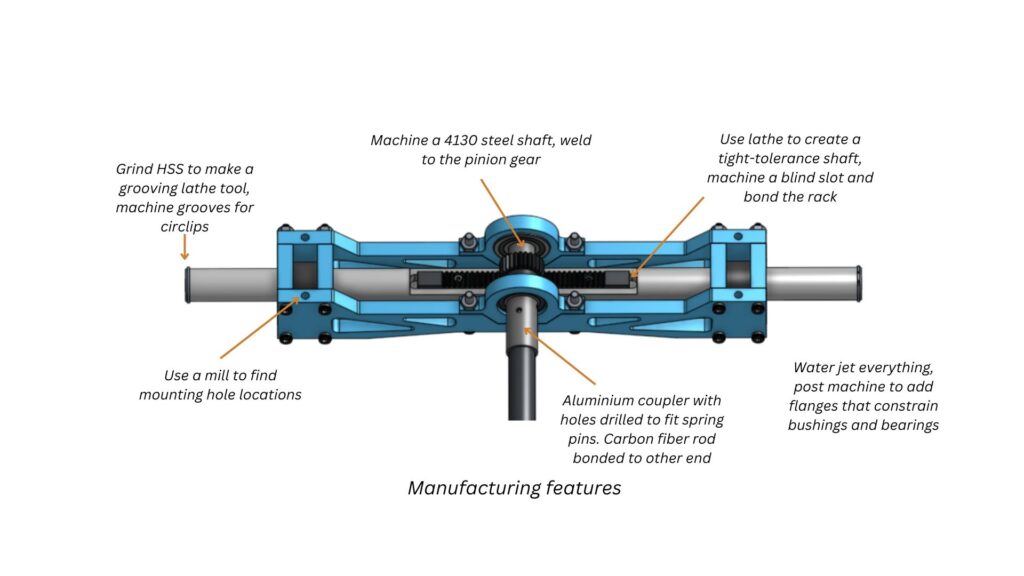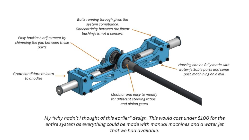 One of my most fun projects has been designing TSVP’s first car’s steering system. Initially, I thought making one from scratch too challenging, and I wasn’t confident in my ability to make something durable enough for my team to trust it as an integral part of the car. However, as the design of the chassis converged to what it became, I found that there was no off-the-shelf steering rack that suited the needs of the car well.